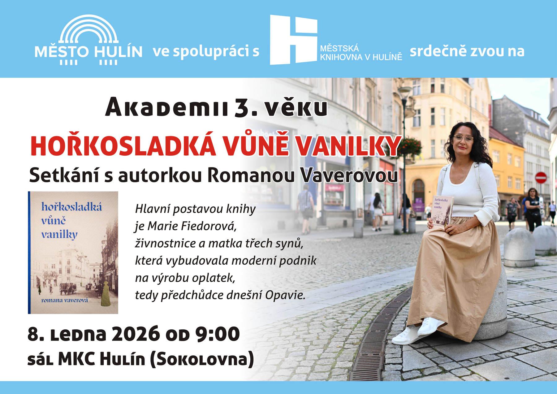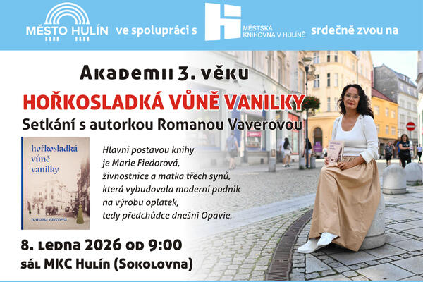 Město Hulín ve spolupráci MěK Hulín srdečně zvou na Akademii 3. věku, která se uskuteční 8. ledna 2026 od 9:00 v sále MKC Hulín.