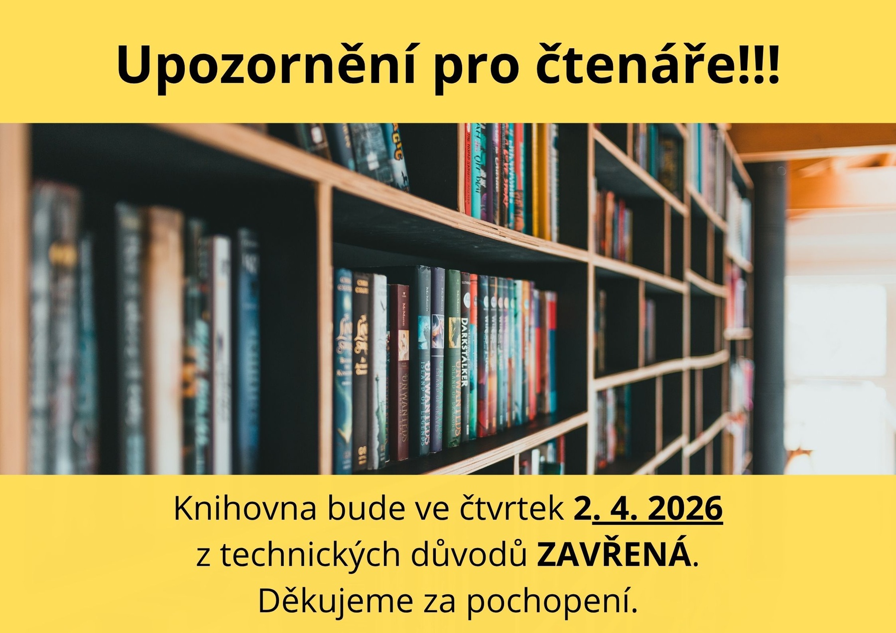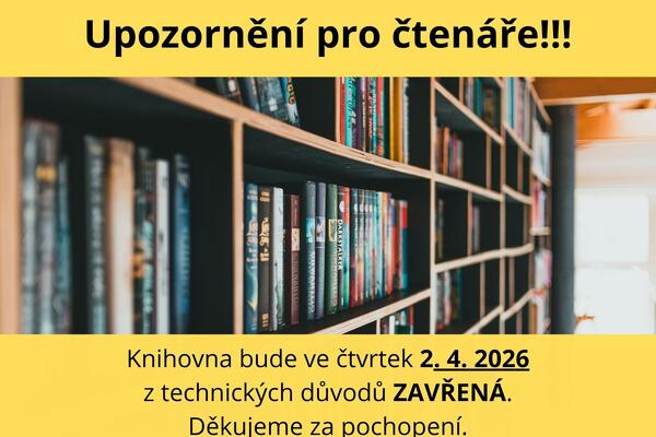 Upozorňujeme čtenáře, že ve čtvrtek 2. 4. 2026 bude knihovna ZAVŘENÁ z technických důvodů.