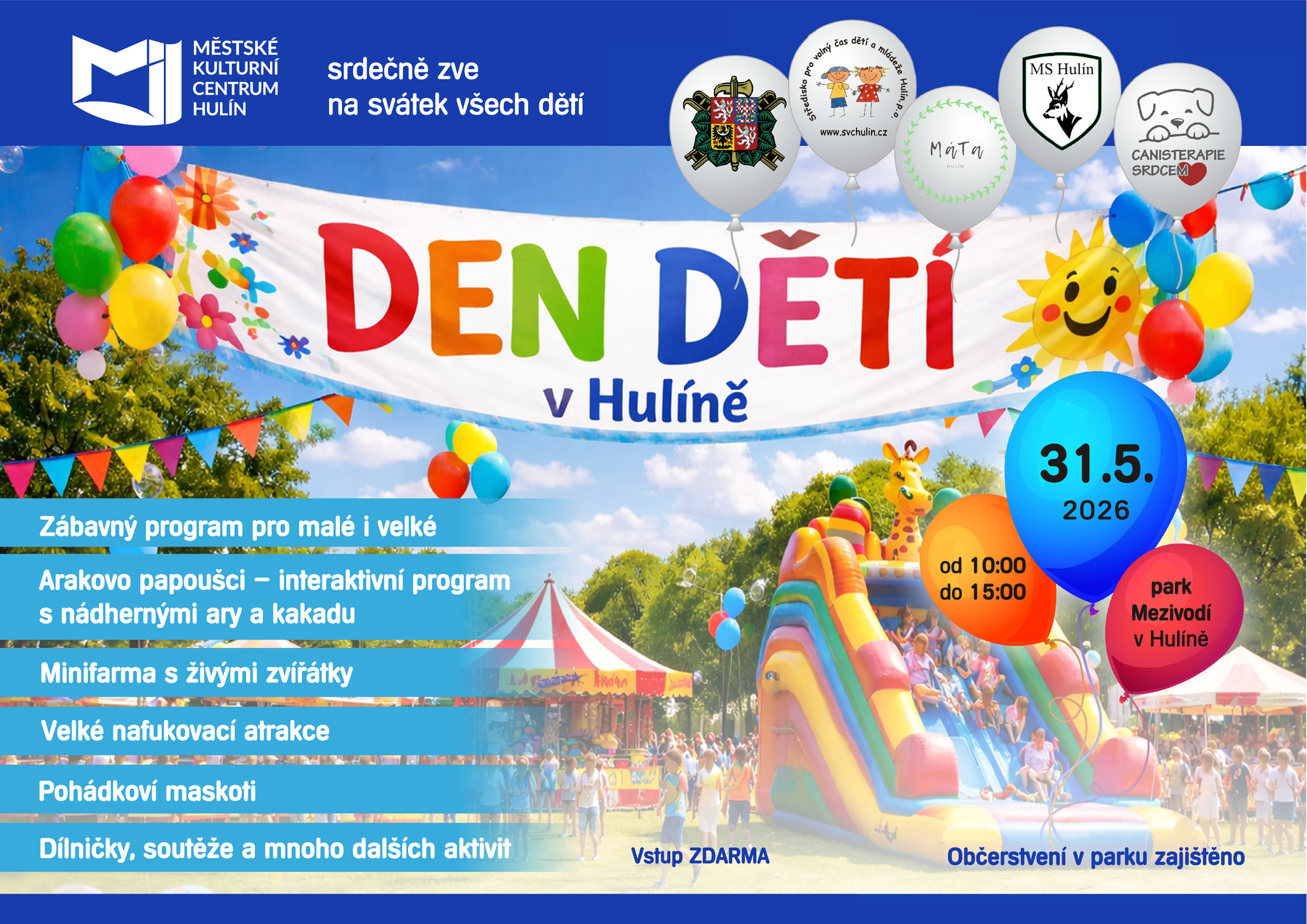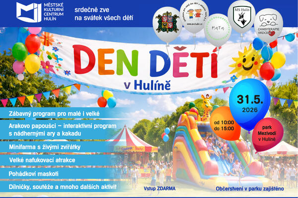 Městské kulturní centrum Hulín srdečně zve na svátek všech dětí na DEN DĚTÍ v Hulíně, který se uskuteční v neděli 31. 5. 2026 od 10:00 do 15:00 v parku Mezivodí v Hulíně.