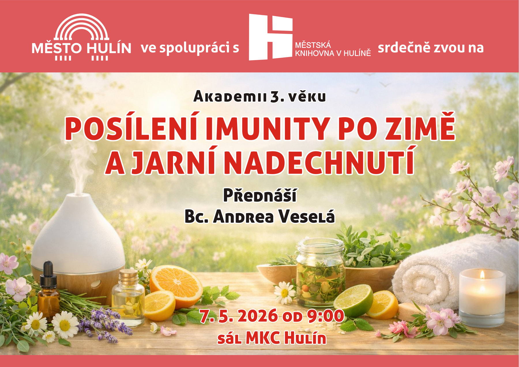 Město Hulín ve spolupráci MěK Hulín srdečně zvou na Akademii 3. věku, která se uskuteční 7. 5 2026 od 9:00 v sále MKC Hulín.